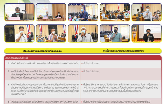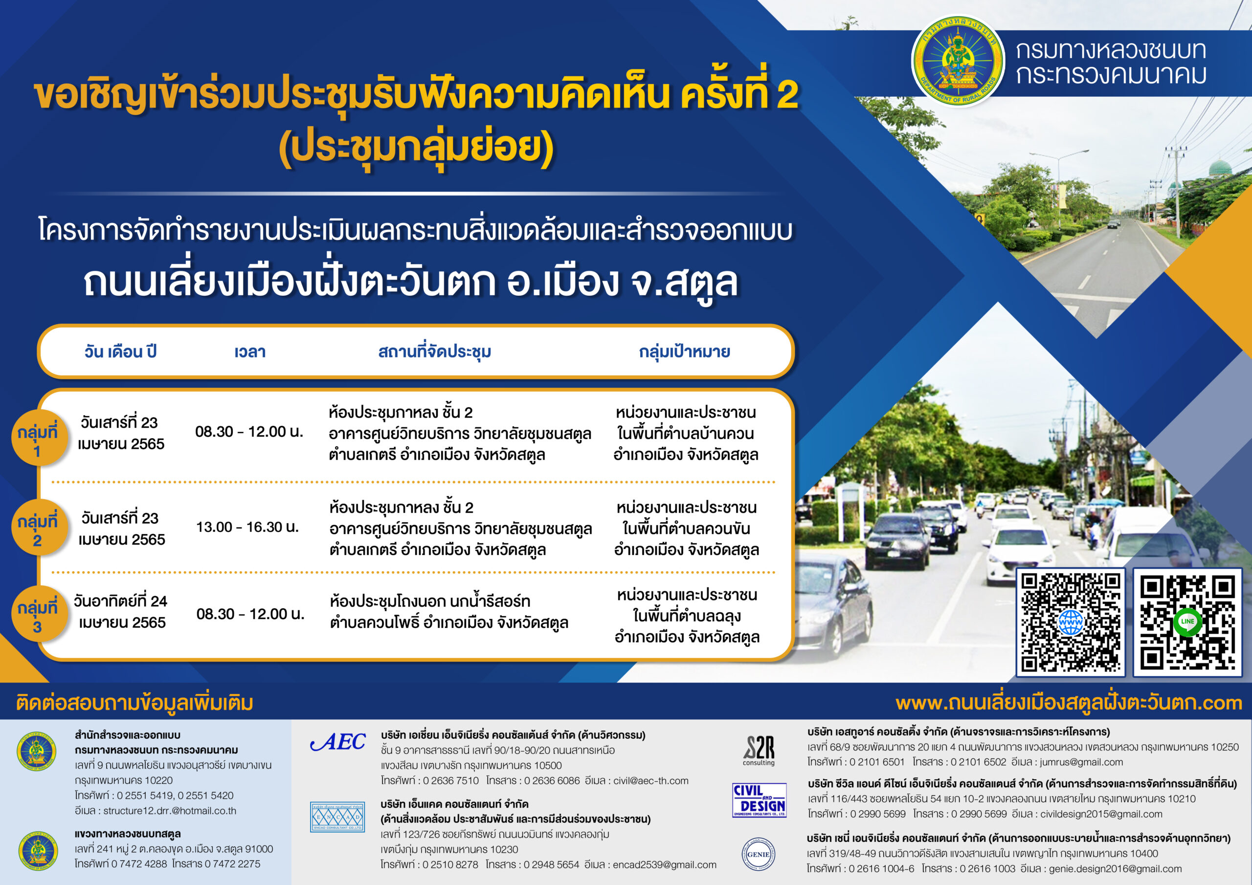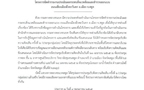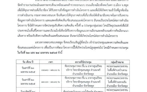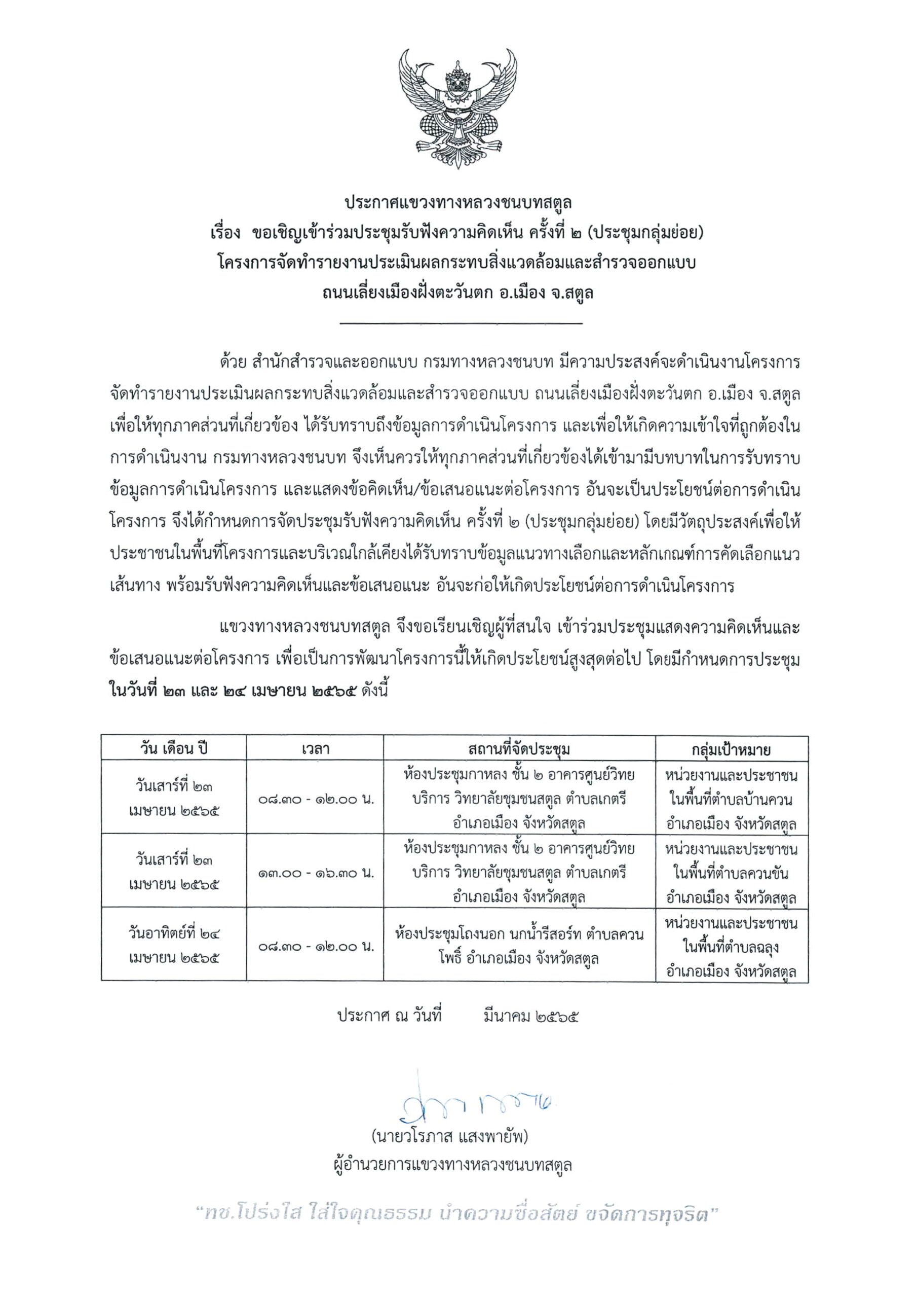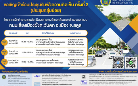 นายดารน เพ็ชร์เนียม รองนายกองค์การบริหารส่วนตำบลควนขัน ได้ให้เกียรติเป็นประธานกล่าวเปิดการประชุมรับฟังความคิดเห็นครั้งที่ 2 (ประชุมกลุ่มย่อย) กลุ่มพื้นที่ตำบลบ้านควนและตำบลควนขัน โดยมีนายจิรานุวัฒน์ จันทร์จร ผู้อำนวยการกลุ่มออกแบบทาง กรมทางหลวงชนบท ร่วมชี้แจงรายละเอียดโครงการ ณ ห้องประชุมกาหลง ชั้น 2 อาคารศูนย์วิทยบริการ วิทยาลัยชุมชนสตูล ตำบลเกตรี อำเภอเมือง จังหวัดสตูล ในการประชุมดังกล่าวมีผู้เข้าร่วมประชุม 50 คน ผู้เข้าร่วมประชุมส่วนใหญ่เห็นด้วยและยินดีให้การสนับสนุนกับโครงการนี้